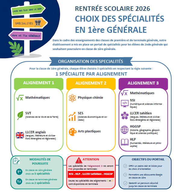 Au lycée des îles sous le vent, depuis la rentrée 2025, le choix des spécialités est le suivant :